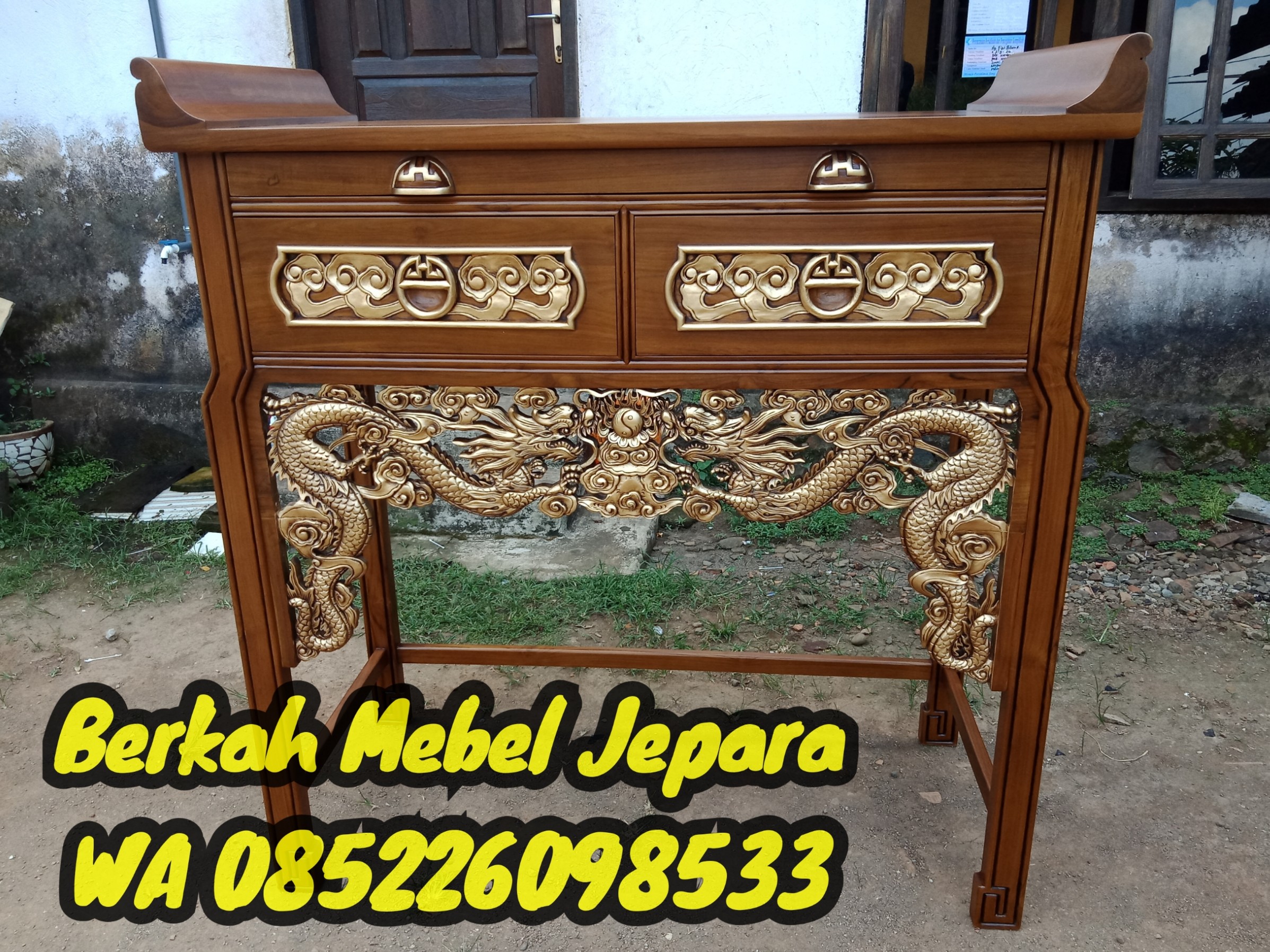 Meja sembahyang jepara merupakan produk unggulan kami yang terbuat dari kayu jati perhutani kering dan tua memiliki ukuran fengshui bagus yaitu panjang 127cm lebar ke belakang 60cm tinggi meja 126cm dengan type meja tarik dan dua laci, meja sembahyang jepara dikerjakan langsung oleh tenaga kerja kami yang sudah profesional dalam bidangnya masing masing serta memiliki jiwa seni yang tinggi.
